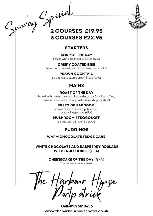 We serve morning rolls, lunch & dinners every day! this is in our bright sea facing conservatory, bar, lounge or patio/terrace. Meals are carefully prepared and presented, using only fresh ingredients. Enjoy some of the best views in Portpatrick from our seafront restaurant. Dogs are welcome in the bar and lounge.